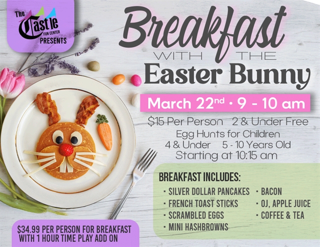 Breakfast With The Easter Bunny!March 22, 2026 9 am-10 am$15 Per Person 2 and under FreeBreakfast includes:Silver Dollar PancakesFrench Toast SticksScrambled EggsMini HashbrownsBaconOJ, Apple JuiceCoffee and Tea